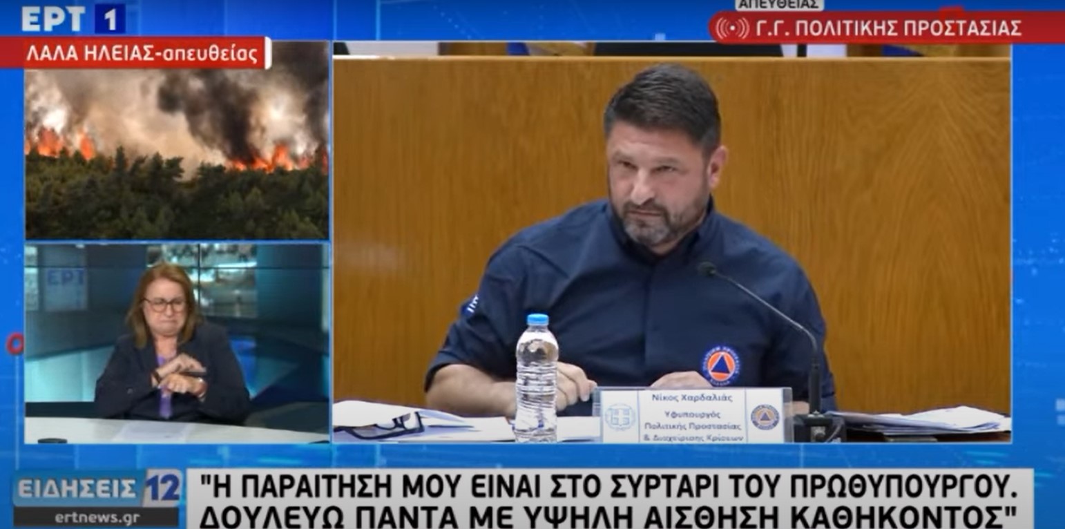 Ο Νίκος Χαρδαλιάς έδωσε μία συνέντευξη Τύπου η οποία διακρίθηκε από την προσπάθειά του να δικαιολογήσει τους χειρισμούς τους δικούς του και της κυβέρνησης, επιχειρώντας να «απαντήσει» σε κάθε κριτική, από την διάθεση των εναέριων μέσων και την απουσία που διαπιστώθηκε σε πλήθος σημείων όλες τις προηγούμενες ημέρες, μέχρι και την αναφορά του στο «χειρότερο καιρικό φαινόμενο όλων των εποχών».