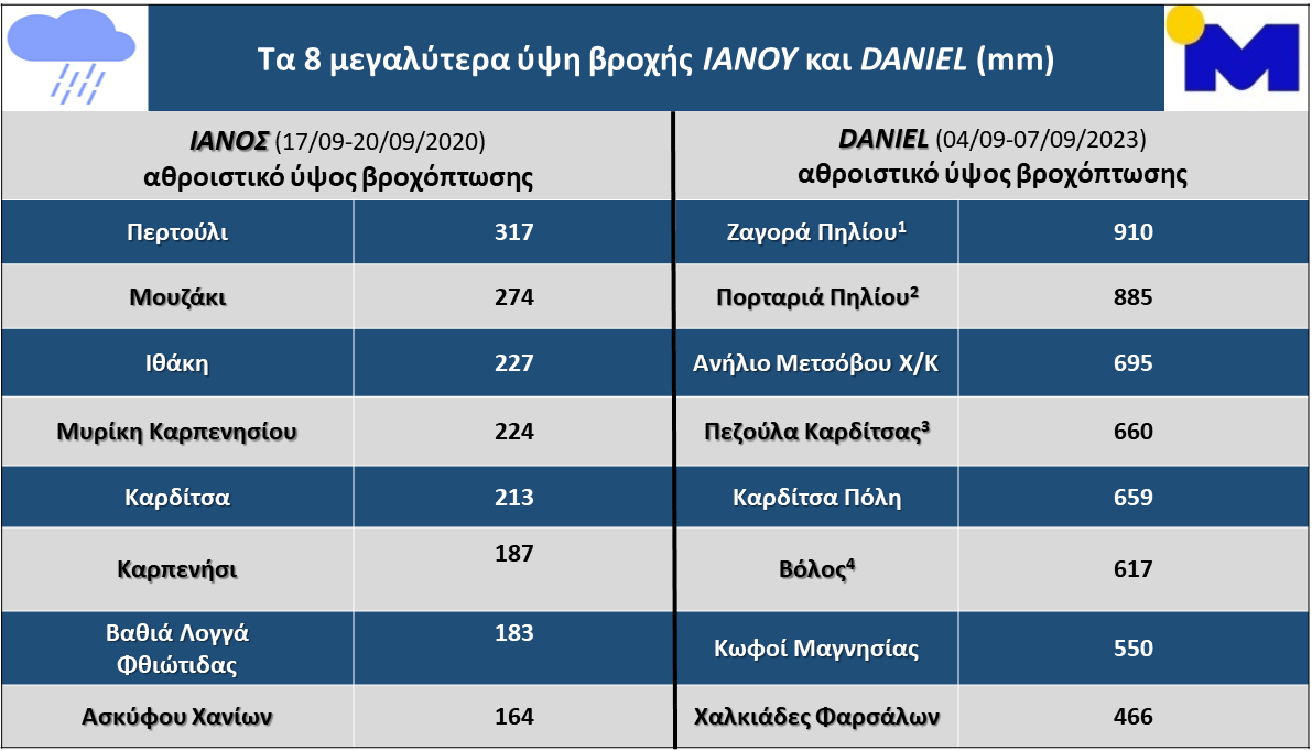 Χαρακτηριστικά, κατά τη διάρκεια του Ιανού είχαν καταγραφεί αθροιστικά ύψη βροχόπτωσης 317 mm (Περτούλι), 274 mm (Μουζάκι) και 227 mm (Ιθάκη), όταν κατά την επέλαση της κακοκαιρίας Daniel καταγράφηκαν αθροιστικά ύψη βροχόπτωσης αισθητά μεγαλύτερα.