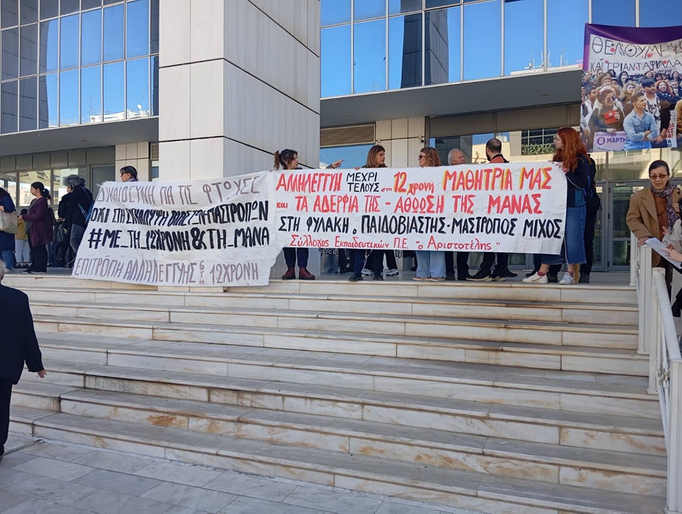 Έξω από το δικαστήριο αυτή την ώρα υπάρχει διαμαρτυρία αλληλεγγύης στη 12χρονη και την οικογένειά της. Η Επιτροπή Αλληλεγγύης στη 12χρονη και η Λαϊκή Συνέλευση Κολωνού-Σεπολίων-Ακ. Πλάτωνος καταγγέλλουν την απόπειρα συγκάλυψης, απεύθυναν κάλεσμα για τη συγκέντρωση με κεντρικό σύνθημα «σε μια κοινωνία γεμάτη από φτωχές, οι εισαγγελείς ξεπλένουν μαφιόζους, βιαστές».