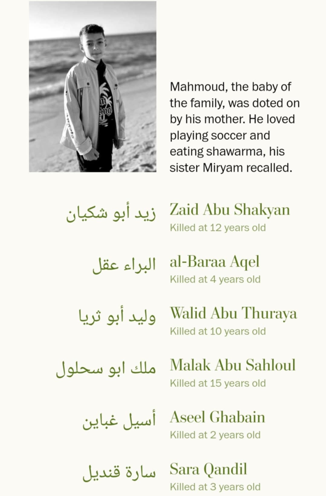 «Ο Μαχμούντ, το μωρό της οικογένειας, ήταν το αγαπημένο παιδί της μητέρας του. Του άρεσε να παίζει ποδόσφαιρο και να τρώει shawarma, θυμάται η αδελφή του Μιριάμ» είναι η αναφορά δίπλα από την φωτογραφία του Μαχμούντ, που δολοφονήθηκε στην ηλικία των δεκατεσσάρων.