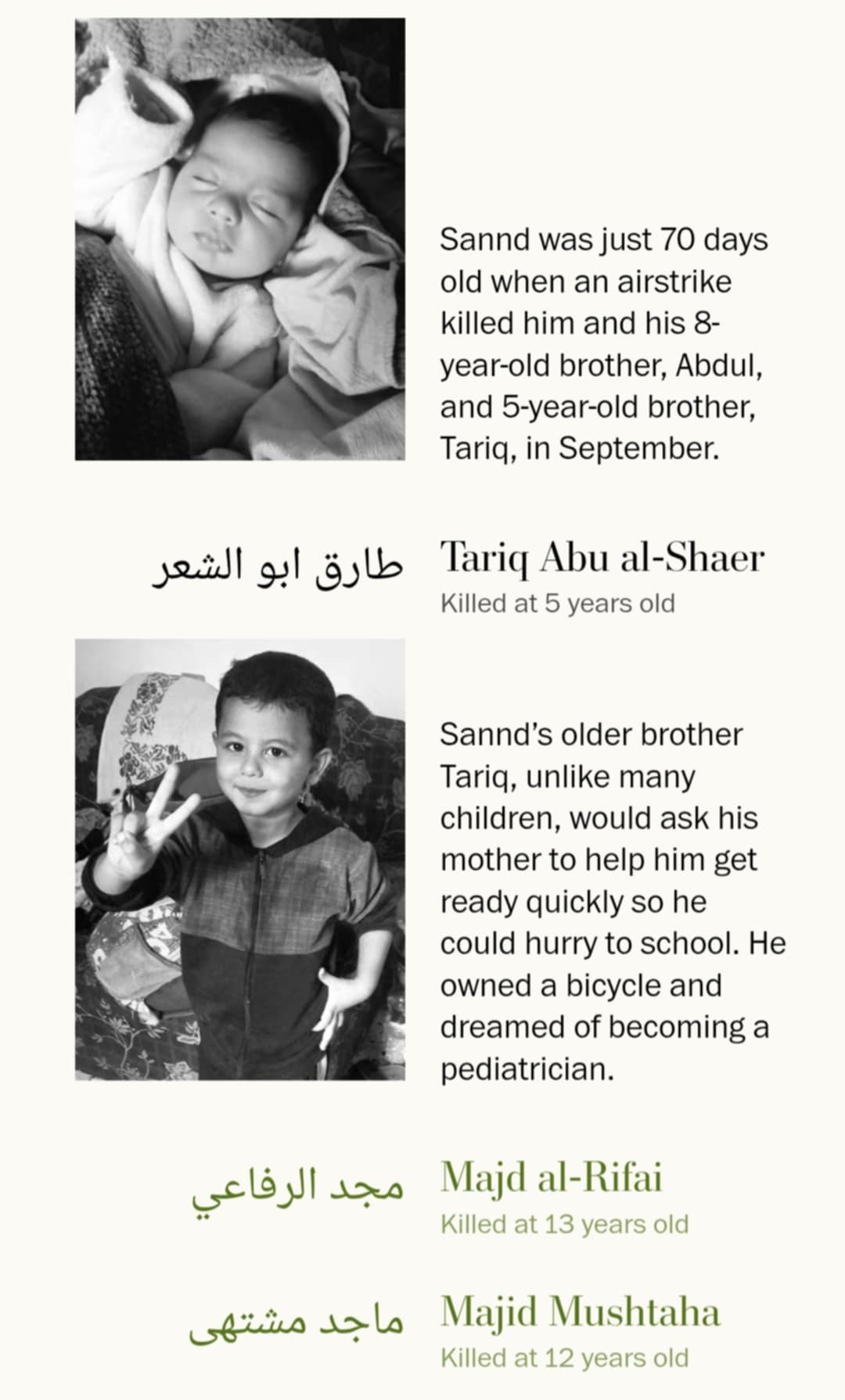 Οι πληροφορίες που δημοσίευσε η εφημερίδα για τον Σαντ είναι πως ήταν μόλις 70 ημερών όταν μια αεροπορική επιδρομή σκότωσε τον ίδιο, τον 8χρονο αδελφό του Αμπντούλ και τον 5χρονο αδελφό του Ταρίκ, τον Σεπτέμβριο. Ο Ταρίκ είχε ένα ποδήλατο και ονειρευόταν να γίνει παιδίατρος.