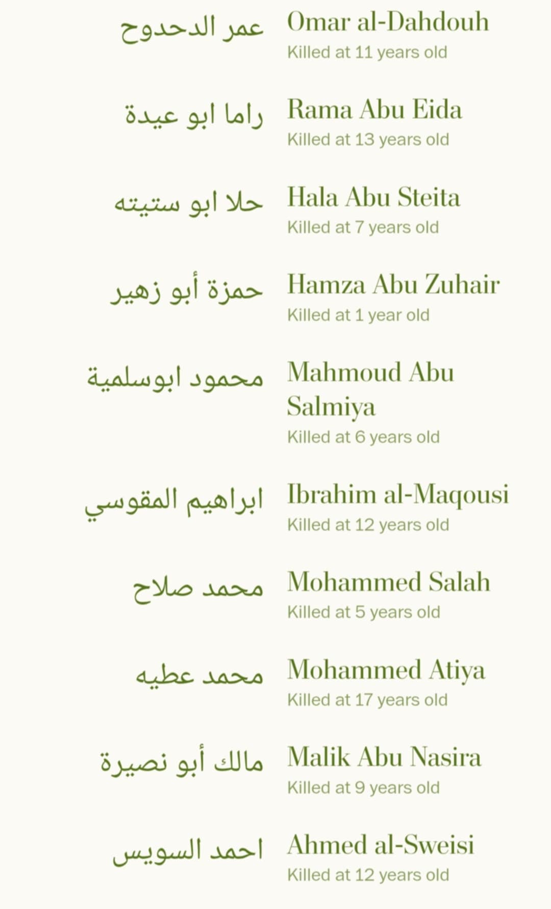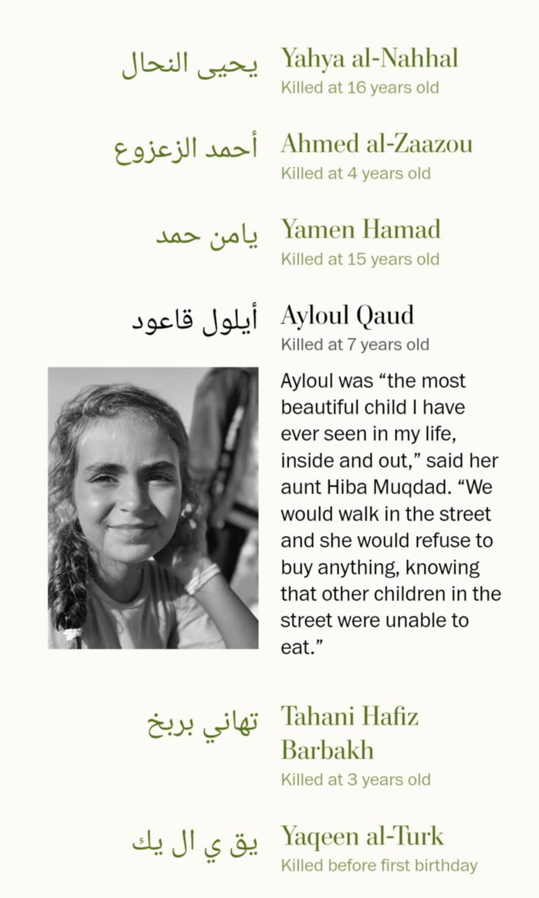 Η Ayloul Qaud, η οποία απεικονίζεται στην φωτογραφία παρακάτω, δολοφονήθηκε στα 7 της έτη. «Η Ayloul ήταν “το πιο όμορφο παιδί που έχω δει στη ζωή μου, τόσο εσωτερικά όσο και εξωτερικά”, είπε η θεία της, Hiba Muqdad. “Περπατούσαμε στο δρόμο και αρνιόταν να αγοράσει οτιδήποτε, γνωρίζοντας ότι άλλα παιδιά στο δρόμο δεν είχαν να φάνε”» γράφει το σημείωμα δίπλα από την εικόνα της.