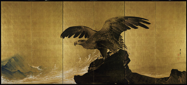 To άρθρο στολίζει το έργο «Αητός στα βράχια» παραδοσιακής Ιαπωνικής ζωγραφικής σε παραβάν.