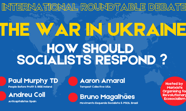 Ξεκινά ο Paul Murphy, κατακεραυνώνοντας την πολεμική προπαγάνδα πανταχόθεν: αυτήν εντός της Ρωσίας, που φιμώνει όσους συντρόφους αντιστέκονται στο καθεστώς Πούτιν, και αυτή στη Δύση, που σπρώχνει τους ιρλανδούς πολιτικούς να χαρακτηρίζουν ως «μαριονέττες του Πούτιν» όσους εναντιώνονται στην αποστολή στρατιωτικής βοήθειας στην Ουκρανία από την ιρλανδική κυβέρνηση. Ο Paul ξεκαθαρίζει από την αρχή ότι υποθέτει πως όλοι δέχονται πως ο Πούτιν είναι ένας απολυταρχικός ηγέτης με δεξιά πολιτική, πως το ΝΑΤΟ έχει αρνητικό ρόλο διεθνώς, προάγοντας την αμερικανική ηγεμονία, πως η Ρωσία πραγματοποιεί μια ιμπεριαλιστική εισβολή, και πως βρίσκονται όλοι στο πλευρό των Ουκρανών που μάχονται για την εθνική τους απελευθέρωση. Εδώ όμως αρχίζει η διαφοροποίηση μεταξύ μας, διαπιστώνει ο Paul. Κατά τον ίδιο, πρόκειται για μια ενδο-ιμπεριαλιστική σύγκρουση (ο όρος θα επανέλθει πολλές φορές κατά τη διάρκεια της βραδιάς) και η επαναστατική Αριστερά θα πρέπει να αντιπαρατεθεί και στις δυο πλευρές. Το ΝΑΤΟ επεκτείνονταν επικίνδυνα πριν τον πόλεμο, αλλά τώρα η επέκταση αυτή έχει επιταχυνθεί, βλέπε Φινλανδία και Σουηδία, και έχει προστεθεί και ο οικονομικός πόλεμος εναντίον της Ρωσίας. Το κλειδί για τον Paul είναι να υποστηρίζουμε τους Ουκρανούς εναντίον της Ρωσίας, αλλά χωρίς να στηρίζουμε τη δυτική φιλονατοϊκή ατζέντα. Το πώς θα γίνει αυτό μπορεί να διαφέρει από χώρα σε χώρα, σημειώνει, και εξηγεί ότι στην Ιρλανδία αυτό που μπορούν να κάνουν είναι να εναντιώνονται στην περαιτέρω στρατιωτικοποίηση και στην αποστολή όπλων, γιατί αν δεχτούμε ότι το ΝΑΤΟ και ο αμερικανικός ιμπεριαλισμός μπορεί να είναι φορέας θετικής αλλαγής σε αυτή τη σύγκρουση, τότε ακυρώνουμε το βασικό μας επιχείρημα αναφορικά με όλους τους προηγούμενους νατοϊκούς πολέμους αλλά και με όλους τους επόμενους.