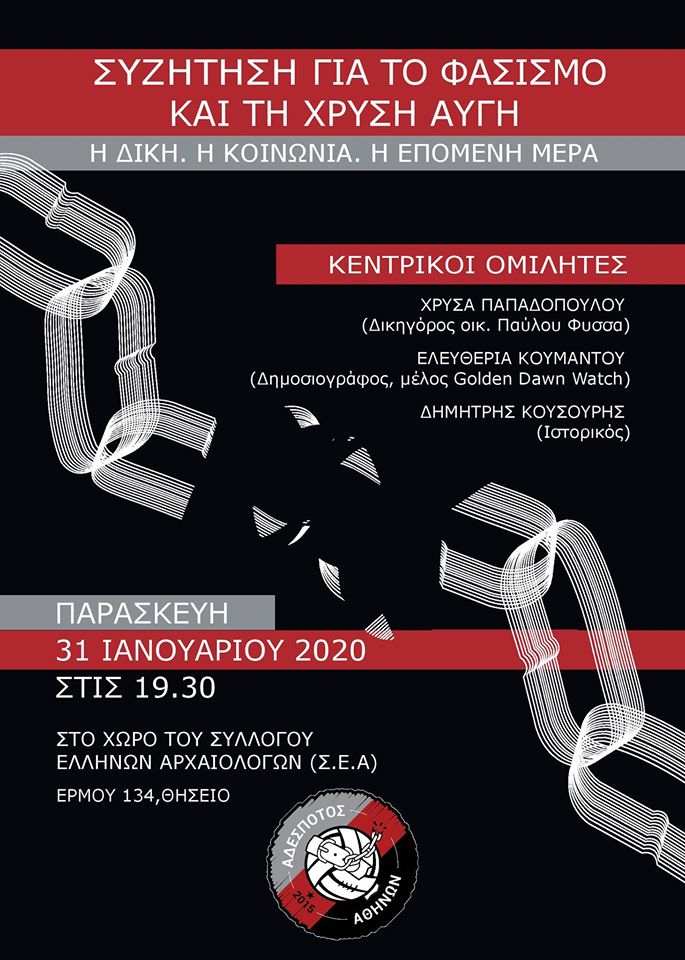 «Τριάντα χρόνια οργανωμένης δράσης με αμέτρητες γνωστές και άγνωστες εγκληματικές πράξεις. Έξι και πλέον χρόνια πριν, ο Παύλος Φύσσας δολοφονείται απροκάλυπτα και οργανωμένα από το βασικό μέλος της εγκληματικής ομάδας της Χ.Α., Ρουπακιά. Σήμερα, η εισαγγελέας Οικονόμου προτείνει “την απαλλαγή από την κατηγορία της ένταξης και διεύθυνσης εγκληματικής οργάνωσης όλων των κατηγορουμένων”» αναφέρει ο Αδέσποτος Αθηνών που μας καλεί σε συζήτηση την Παρασκευή 31 Ιανουαρίου, στις 19:30 στον Σύλλογο Ελλήνων Αρχαιολόγων (Σ.Ε.Α., Ερμού 134, Θησείο).