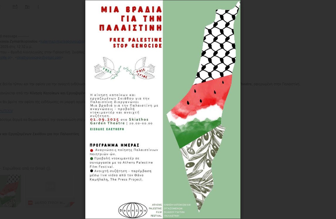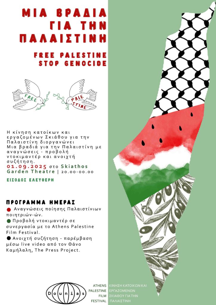 Τη Δευτέρα 01/09/2025 στις 20:00 αφιερώνουμε μια βραδιά για την Παλαιστίνη και στον αγώνα του Παλαιστινιακού λαού. Η ανοιχτή εκδήλωση θα φιλοξενηθεί στον χώρο του Skiathos Garden Theatre και θα περιλαμβάνει:
