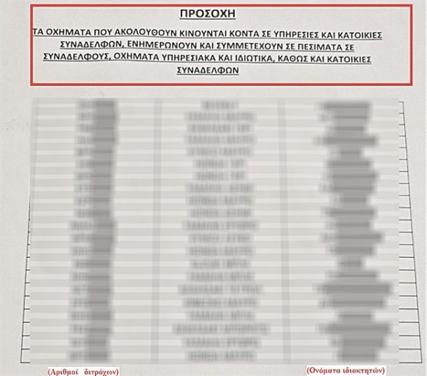 η φωτογραφία της λίστας που δημοσίευσε το in.gr, με θολωμένες και τις πινακίδες των οχημάτων