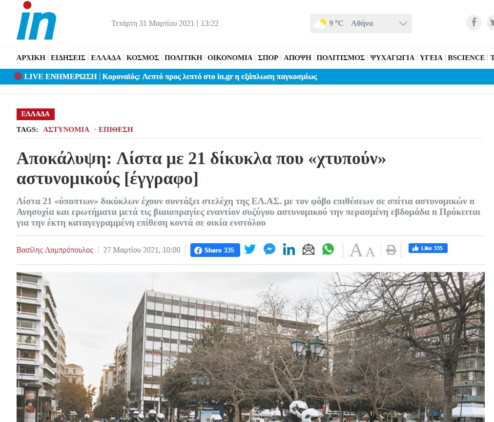 Μία «λίστα με 21 δίκυκλα που “χτυπούν” αστυνομικούς», με τις πινακίδες και τον τύπο των οχημάτων και σβησμένα τα ονόματα των φερόμενων κατόχων δημοσίευσε προ ημερών το in.gr, στοχοποιώντας έτσι δεκάδες κατόχους οχημάτων σε δημοσίευμα που αναφέρεται σε επίθεση που φέρεται να δέχθηκε σύζυγος αστυνομικού στην Αθήνα.