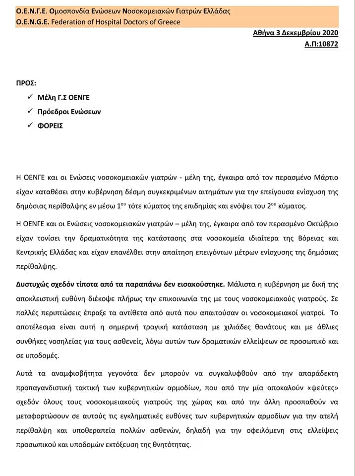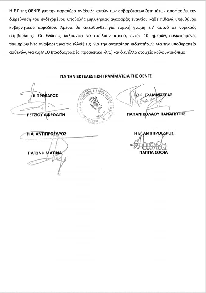 «Αυτά τα αναμφισβήτητα γεγονότα δεν μπορούν να συγκαλυφθούν από την απαράδεκτη προπαγανδιστική τακτική των κυβερνητικών αρμοδίων, που από τη μία αποκαλούν “ψεύτες” σχεδόν όλους τους νοσοκομειακού γιατρούς της χώρας και από την άλλη προσπαθούν να μεταφορτώσουν σε αυτούς τις εγκληματικές ευθύνες των κυβερνητικών αρμοδίων» τονίζει επίσης η ΟΕΝΓΕ.