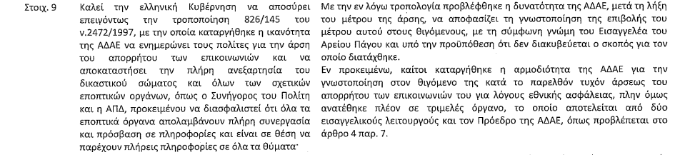 Ίσως το μόνο που παραδέχεται η κυβέρνηση είναι ότι πράγματι, κατήργησε την αρμοδιότητα της ΑΔΑΕ να ενημερώνει έναν πολίτη για αρχή απορρήτου που έχει πραγματοποιηθεί στο παρελθόν. Σημειώνει ωστόσο ότι η αρμοδιότητα αυτή ανατέθηκε σε ένα τριμελές όργανο, με «δύο εισαγγελικούς λειτουργούς και τον Πρόεδρο της ΑΔΑΕ». Παραλείπει όμως να αναφέρει ότι πέρα από τον περιορισμό της Ανεξάρτητης Αρχής, που έχει επικρίνει επανειλημμένα και ο Πρόεδρός της, Χρήστος Ράμμος, προβλέφθηκε ότι η ενημέρωση του θιγόμενου μπορεί να γίνει μόνο μετά από τουλάχιστον 3 χρόνια από το τέλος της παρακολούθησης και χωρίς να του γνωστοποιηθεί ο λόγος. Κριτική σε αυτές τις προβλέψεις είχε ασκήσει και η επιστημονική υπηρεσία της Βουλής.