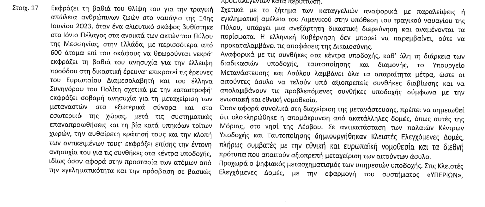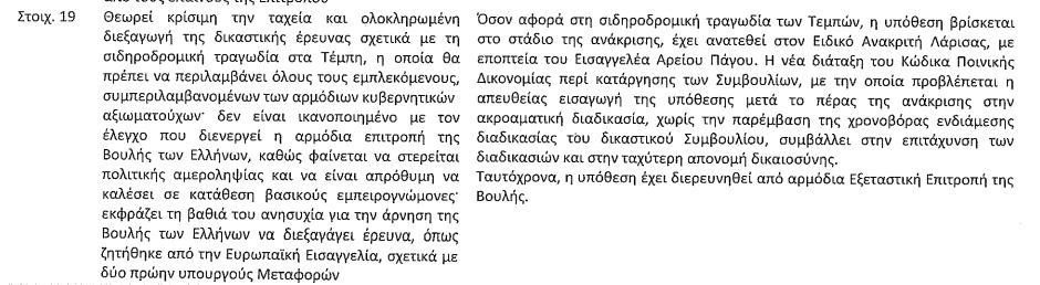 Λίγο πιο κάτω, στα συμπεράσματα – συστάσεις προς την Ελλάδα, το ψήφισμα ασκεί κριτική στη μεροληψία της Εξεταστικής, ενώ καταγγέλλει την απροθυμία να καλέσει βασικούς μάρτυρες. «Θεωρεί κρίσιμη την ταχεία και ολοκληρωμένη διεξαγωγή της δικαστικής έρευνας σχετικά με τη σιδηροδρομική τραγωδία στα Τέμπη, η οποία θα πρέπει να περιλαμβάνει όλους τους εμπλεκομένους, συμπεριλαμβανομένων των αρμόδιων κυβερνητικών αξιωματούχων· δεν είναι ικανοποιημένο με τον έλεγχο που διενεργεί η αρμόδια επιτροπή της Βουλής των Ελλήνων, καθώς φαίνεται να στερείται πολιτικής αμεροληψίας και να είναι απρόθυμη να καλέσει σε κατάθεση βασικούς εμπειρογνώμονες· εκφράζει τη βαθιά του ανησυχία για την άρνηση της Βουλής των Ελλήνων να διεξαγάγει έρευνα, όπως ζητήθηκε από την Ευρωπαϊκή Εισαγγελία, σχετικά με δύο πρώην υπουργούς Μεταφορών».
