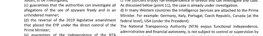 Η κυβέρνηση απορρίπτει και την σύσταση του Ευρωκοινοβουλίου «να ακυρωθεί η νομοθετική τροποποίηση του 2019 που έθεσε την ΕΥΠ υπό τον άμεσο έλεγχο του πρωθυπουργού», επικαλούμενη «παραδείγματα δυτικών χωρών» όπου συμβαίνει το ίδιο, όπως Γερμανία, Ιταλία και ΗΠΑ. Δεν σχολιάζει τις «σοβαρές ανησυχίες του Ευρωκοινοβουλίου» για την «επιρροή του Πρωθυπουργού στην ΕΥΠ»