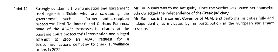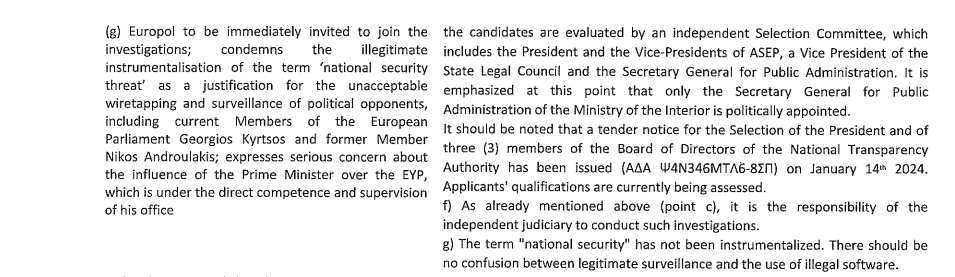 Συγκεκριμένα, στο σημείο όπου το Ευρωκοινοβούλιο «καταδικάζει την παράνομη εργαλειοποίηση του όρου “απειλή για την εθνική ασφάλεια” ως δικαιολογία για τις απαράδεκτες υποκλοπές και την παρακολούθηση πολιτικών αντιπάλων, περιλαμβανομένων του νυν βουλευτού του Ευρωπαϊκού Κοινοβουλίου, Γεωργίου Κύρτσου, και του πρώην βουλευτού του Ευρωπαϊκού Κοινοβουλίου, Νίκου Ανδρουλάκη», η κυβέρνηση απαντάει ότι «ο όρος “εθνική ασφάλεια δεν έχει εργαλειοποιηθεί», προσθέτοντας ότι «δεν πρέπει να υπάρχει σύγχυση μεταξύ νόμιμης παρακολούθησης και χρήσης παρανομου λογισμικού». Δεν υπάρχει καμία τέτοια «σύγχυση» αντιθέτως υπάρχει η «σύμπτωση» της παράλληλης παρακολούθησης προσώπων από ΕΥΠ και Predator.