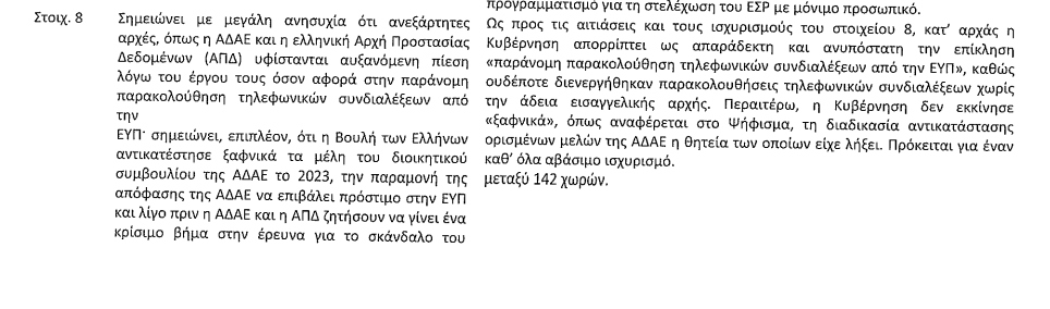 Ιδιαίτερα έντονη είναι η απάντηση της κυβέρνησης στο σημείο του ψηφίσματος που κάνει λόγο για «παράνομες παρακολουθήσεις της ΕΥΠ». Η Κυβέρνηση «απορρίπτει ως απαράδεκτη και ανυπόστατη την επίκληση “παράνομη παρακολούθηση τηλεφωνικών συνδιαλέξεων από την ΕΥΠ”, καθώς ουδέποτε διενεργήθηκαν παρακολουθήσεις τηλεφωνικών συνδιαλέξεων χωρίς την άδεια εισαγγελικής αρχής».Υπενθυμίζεται ότι η ΕΥΠ παρακολουθούσε πολιτικούς, όπως ο Πρόεδρος του ΠΑΣΟΚ, Νίκος Ανδρουλάκης και ο ευρωβουλευτής, Γιώργος Κύρτσος, Υπουργούς της κυβέρνησης, όπως ο Κωστής Χατζηδάκης, ανώτατους στρατιωτικούς, όπως ο Αρχηγός ΓΕΕΘΑ, Κωνσταντίνος Φλώρος και δημοσιογράφους, όπως ο Σταύρος Μαλιχούδης, ο Θανάσης Κουκάκης και ο Τάσος Τέλλογλου. Η κυβέρνηση κρύβεται πίσω από το ότι η τότε εισαγγελέας της ΕΥΠ, Β.Βλάχου, είχε εγκρίνει αυτές τις παρακολουθήσεις. Είναι μερικές μόνο από τις πολλές χιλιάδες παρακολουθήσεις που υπογράφονταν κάθε χρόνο, δεκάδες κάθε μέρα, από μόνο μία εισαγγελέα. Η πειθαρχική δίωξη της Β.Βλάχου, που ήταν υπό παρακολούθηση από το Predator σύμφωνα με έρευνα της Αρχής Προστασίας Προσωπικών Δεδομένων που επιβεβαίωσε αποκαλύψεις του Documento, αρχειοθετήθηκε πριν δύο μήνες.