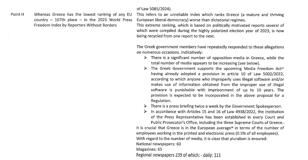 Στα θέματα Ελευθερίας των ΜΜΕ και κρατικών χρηματοδοτήσεων, η κυβέρνηση επαναλαμβάνει επιχειρήματα που έχει καταθέσει επανειλημμένα στον ελληνικό δημόσιο διάλογο. Στην αναφορά του Ευρωκοινοβουλίου στη θέση 107 της Ελλάδας στην ετήσια λίστα των «Ρεπόρτερ Χωρίς Σύνορα», απαντάει ότι «πρόκειται για μία αναξιόπιστη κατάταξη, που τοποθετεί την Ελλάδα, μία ώριμη και ακμάζουσα ευρωπαϊκή δημοκρατία, κάτω από δικτατορικά καθεστώτα» και όπως υποστηρίζει, «βασίζεται σε πολιτικά υποκινούμενες αναφορές, αρκετές από τις οποίες έγιναν στην ιδιαίτερα πολωμένη εκλογική χρονιά του 2023» Χαρακτηρίζει επίσης «ακραία» την κατάταξη, και υποστηρίζει πως «ανακυκλώνεται από τη μία αναφορά στην επόμενη». Σημειώνεται ότι οι Ρεπόρτερ Χωρίς Σύνορα συνεργάζονται με το Ευρωκοινοβούλιο, ενώ η μεγάλη πτώση της Ελλάδας στην κατάταξη καταγράφηκε το 2022, όταν βρεθήκαμε στην 108η θέση.