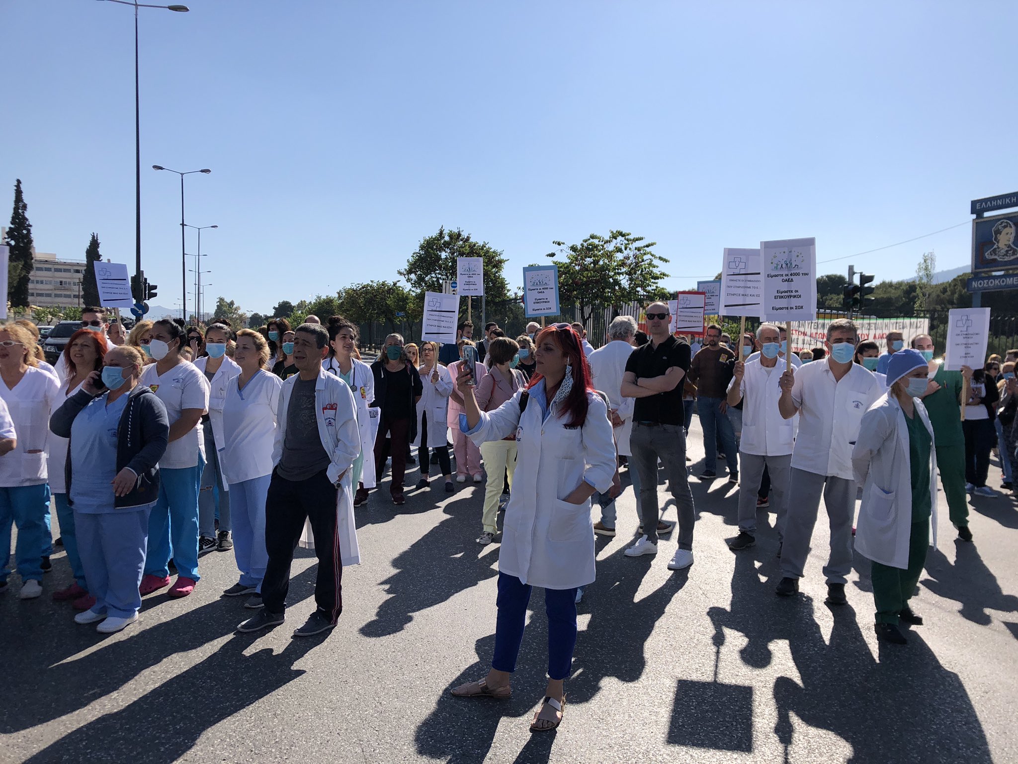 Οι εργαζόμενοι στο Νοσοκομείο «Σωτηρία» προχώρησαν σε συμβολική ολιγόλεπτη διακοπή της κυκλοφορίας των οχημάτων στη λεωφόρο Μεσογείων με τους οδηγούς να βγαίνουν από τα οχήματα τους και να τους χειροκροτούν.