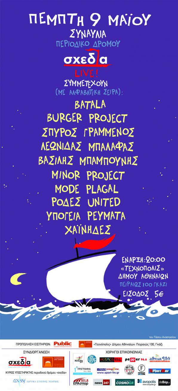 Ίσως να μην υπάρχει πιο ταιριαστή περίπτωση για τη φράση «όλοι οι δρόμοι οδηγούν στην «Τεχνό – πολη»! Η «σχεδία» το μοναδικό ελληνικό περιοδικό δρόμου και η «Τεχνόπολις» του Δήμου Αθηναίων, συνδιοργανώνουν μια μεγάλη συναυλία το βράδυ της Πέμπτης 9 Μαϊου, στις 20:00.