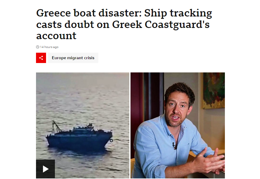 «Η Frontex, η συνοριακή δύναμη της ΕΕ, αναφέρει ότι εντόπισε για πρώτη φορά το σκάφος με τους μετανάστες γύρω στις 08:00 ώρα Ελλάδας την Τρίτη και ενημέρωσε τις ελληνικές αρχές.Το Alarm Phone, μια τηλεφωνική γραμμή έκτακτης ανάγκης για μετανάστες που αντιμετωπίζουν πρόβλημα στη θάλασσα, αναφέρει ότι έλαβε μια κλήση στις 12:17 GMT που έλεγε ότι το σκάφος βρισκόταν σε κίνδυνο.Με βίντεο και φωτογραφίες που χρησιμοποιήσαμε και που πιστοποιήθηκαν από το BBC Verify, καθώς και δικαστικά αρχεία και ναυτιλιακά ημερολόγια, αναλύσαμε την κίνηση των σκαφών στην περιοχή τις επόμενες ώρες.