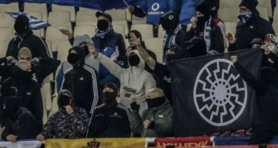 Μία σημαία με τον ναζιστικό «Μαύρο Ήλιο» των SS, μία ακόμα ελληνική με το σήμα του χρυσαυγίτικου μορφώματος, κάψιμο μίας τουρκικής και συνθήματα για τη Βόρειο Ήπειρο, την Αλβανία, τη Μακεδονία, τον Αλέξη Τσίπρα και το Πολυτεχνείο, σε έναν ποδοσφαιρικό αγώνα της Εθνικής Ελλάδας με την Εσθονία, σε μία ακόμα ναζιστική πρόκληση.