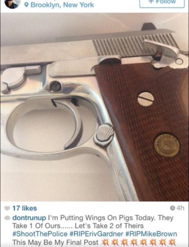 «Σε αυτούς που επέτρεψαν τη βία στους δρόμους κάτω από τη μάσκα της διαμαρτυρίας. Προσπαθήσαμε να προειδοποιήσουμε. Το αίμα θα το δείτε στα σκαλιά του δημαρχείου κι αν το ακολουθήσετε φθάνει μέχρι το γραφείο του δημάρχου» σημείωνε, κατηγορώντας ευθέως τόσο εκείνους που διαμαρτύρονται το τελευταίο διάστημα ενάντια στην αστυνομική βαρβαρότητα, όσο και τον δήμαρχο της πόλης, Μπιλ ντε Μπλάζιο, για την κριτική που άσκησε στις δυνάμεις της αστυνομίας για τη διακριτική συμπεριφορά τους εις βάρος των Αφροαμερικάνων.