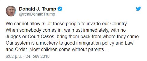 Ο Αμερικανός πρόεδρος, Ντόναλντ Τραμπ, ζήτησε με ανάρτηση του στον προσωπικό του λογαριασμό στο Twitter, να απελαύνονται αμέσως όσοι μπαίνουν παράνομα στις ΗΠΑ, χωρίς να τηρούνται οι δικαστικές διαδικασίες.