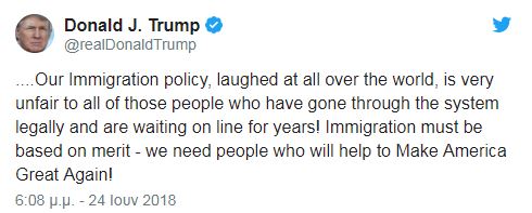 Στη συνέχεια, με δεύτερη ανάρτηση στο Twitter, ο Αμερικανός πρόεδρος τόνισε ότι «είναι πολύ άδικο για εκείνους τους ανθρώπους που έχουν περάσει μέσω του συστήματός μας νόμιμα και περιμένουν στην ουρά για χρόνια. Η μετανάστευση θα πρέπει να βασίζεται σε αξίες. Χρειαζόμαστε ανθρώπους να κάνουν την Αμερική ξανά μεγάλη».
