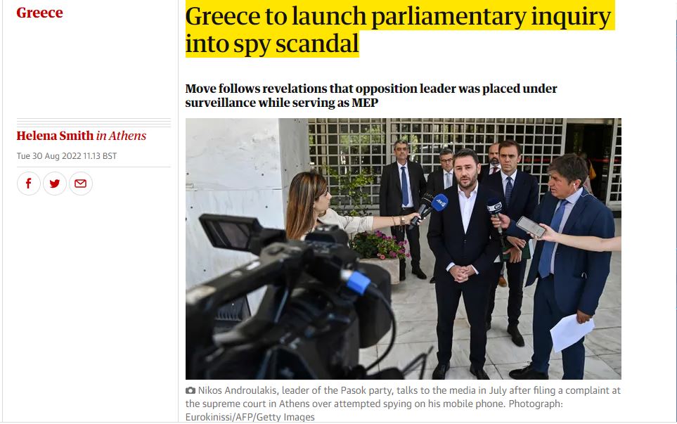 Η δημοσιογράφος στο δημοσίευμα με τίτλο: Greece to launch parliamentary inquiry into spy scandal αρχικά αναφέρεται στις υποκλοπές ως «σκάνδαλο κατασκοπείας που εμπλέκει την κυβέρνηση», ενώ σημειώνει ότι ευρωβουλευτές εντείνουν τις εκκλήσεις τους για σχετική έρευνα. Το δημοσίευμα σημειώνει ότι το ΠΑΣΟΚ πρότεινε τη σύσταση Εξεταστικής Επιτροπής για τη διερεύνηση της υπόθεσης, έχοντας τη σύσσωμη στήριξη των κομμάτων της αντιπολίτευσης, μετά τις αποκαλύψεις ότι ο αρχηγός της ομάδας, Νίκος Ανδρουλάκης, είχε τεθεί υπό παρακολούθηση ενώ υπηρετούσε ως ευρωβουλευτής.