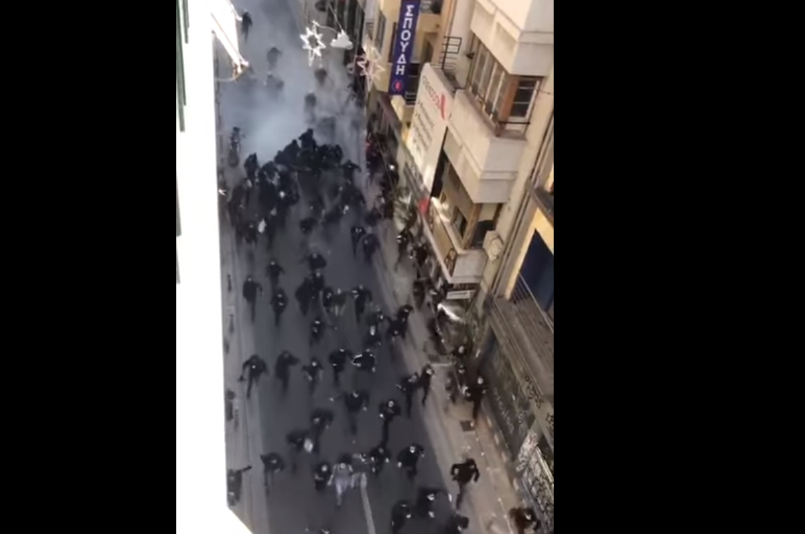 Νέο οπτικοακουστικό υλικό μέσα από κατάστημα δείχνει τη στιγμή που άνδρας των ΜΑΤ με το γκλοπ του σπάει το τζάμι της επιχείρησης. Εργαζόμενοι και πελάτες του φωνάζουν και ακούγεται μια κοπέλα να τον ρωτάει «τι κάνεις, είσαι τρελός»; «Τρελός είμαι, ναι» απαντάει ο ίδιος. Μία γυναίκα τραυματίστηκε στο χέρι.