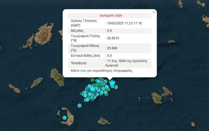 Σύμφωνα με την αυτόματη λύση του Γεωδυναμικού Ινστιτούτου, ο σεισμός έχει ένταση 5 βαθμών της κλίμακας Ρίχτερ, με επίκεντρο 11 χιλιόμετρα νότια νοτιοανατολικά της Αρκεσίνης Αμοργού και σε εστιακό βάθος 5 χιλιομέτρων.