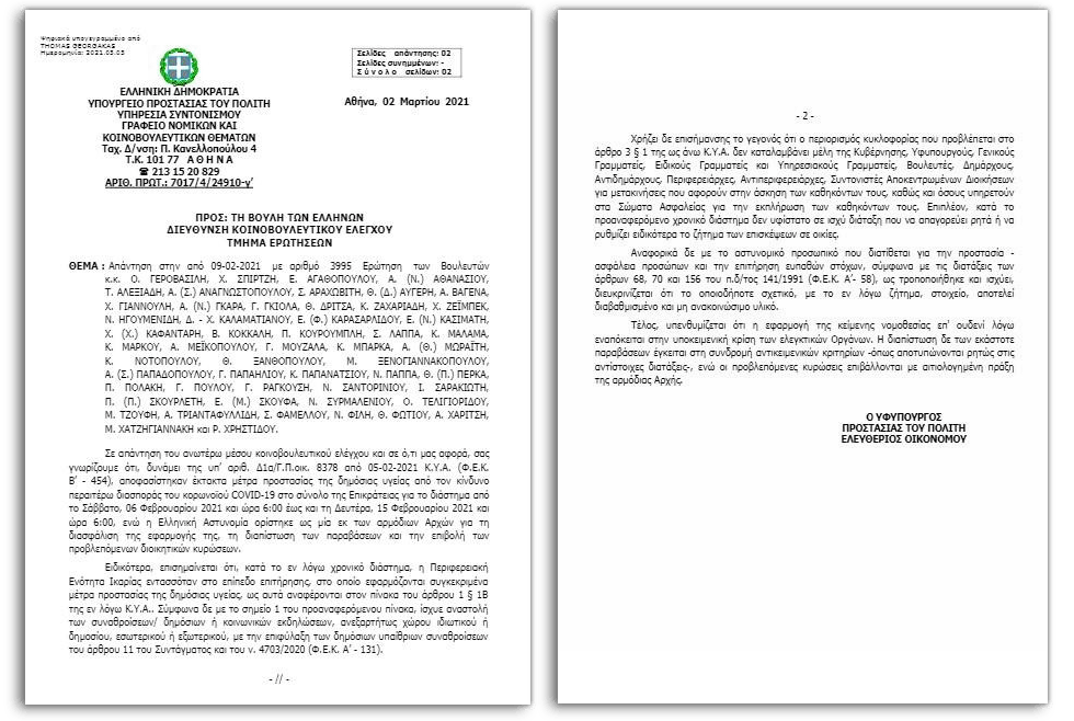 Την απάντηση έδωσε στη Βουλή ο υφυπουργός Προστασίας του Πολίτη, Λευτέρης Οικονόμου, έπειτα από ερώτηση δεκάδων βουλευτών του ΣΥΡΙΖΑ, που ζητούσαν εξηγήσεις για την πρωτοφανή παραβίαση των μέτρων από τον Κυριάκο Μητσοτάκη, υπουργούς και ακολούθους του στο σπίτι του βουλευτή Ικαρίας στις αρχές Φεβρουαρίου.
