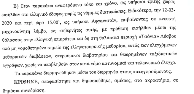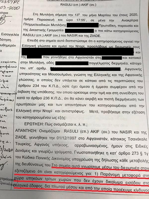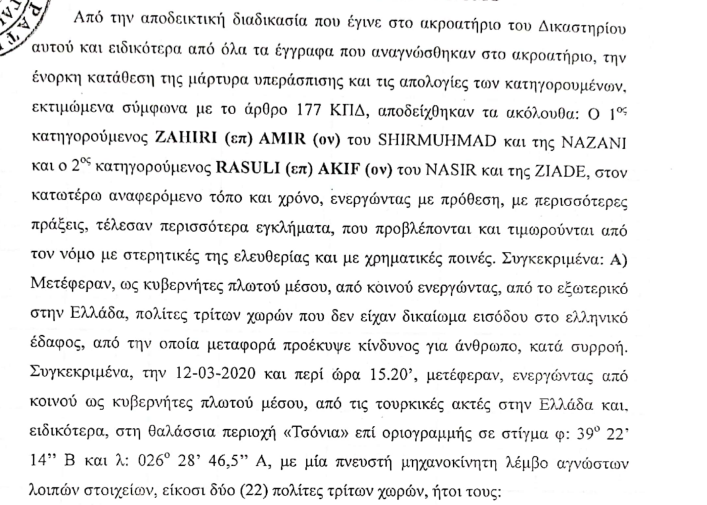 Ο Αμίρ Ζαχίρι και ο Ακίφ Ρασούλι, καταδικάστηκαν σε 50 χρόνια κάθειρξη ο καθένας, για ένα έγκλημα, που όπως όλα δείχνουν, δεν διέπραξαν ποτέ. Η κατηγορία εναντίον τους, στοιχειοθετήθηκε με έναν και μοναδικό μάρτυρα κατηγορίας, ο οποίος κατέθεσε στην προανάκρισή του ότι την Πέμπτη, 12 Μαρτίου του 2020, στη θαλάσσια περιοχή «Τσόνια» της Λέσβου, κατά τη διάρκεια προγραμματισμένης περιπολίας στα πλαίσια μεικτής ευρωπαϊκής επιχείρησης «Ποσειδών 2020», ενημερώθηκε τηλεφωνικά από το Ναυτικό Παρατηρητήριο Κλειούς για εντοπισμό λέμβου. Σκάφος της ελληνικής ακτοφυλακής μετέβη στο σημείο του στίγματος, όπου και εντοπίστηκε η λέμβος με 24 επιβαίνοντες. Όπως αναφέρει στην ένορκη εξέτασή του, «έγιναν προσπάθειες ακινητοποίησης της λέμβου από το Λιμενικό Σώμα, ωστόσο οι δύο κατηγορούμενοι, έσκισαν τη λέμβο εσκεμμένα με αιχμηρό αντικείμενο, με αποτέλεσμα κάποιοι από τους επιβαίνοντες να πέσουν στη θάλασσα και η λέμβος να αρχίζει να είναι σε ημιβυθισμένη κατάσταση. Άμεσα ξεκίνησε η διαδικασία περισυλλογής η οποία ολοκληρώθηκε στις 17:00. (…) Στη συνέχεια, έλαβα εντολή να πλεύσω προς τον λιμένα Μήθυμνας για παράδοση των μεταναστών και των προσφύγων, ενώ στις 21:30 καταπλεύσαμε στον λιμένα Μήθυμνας, όπου παραδώσαμε τους 22 σε στελέχη του Λ/Σ Μήθυμνας, ενώ ταυτόχρονα υποδείξαμε τους δύο που είχαν σκίσει τη λέμβο για να γίνουν οι προβλεπόμενες διαδικασίες».