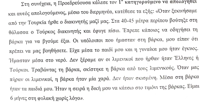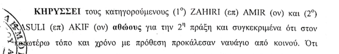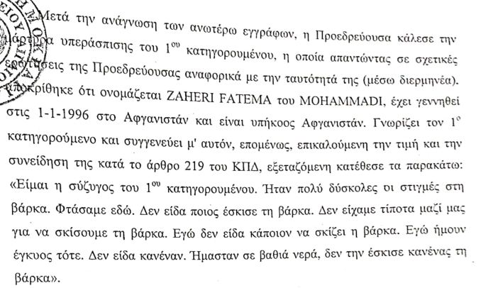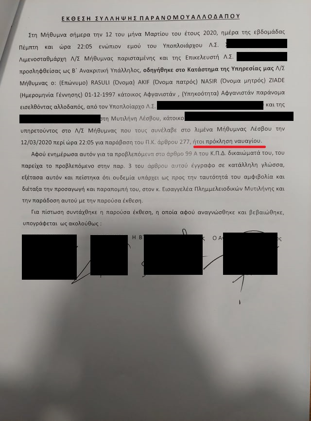 Τα όσα ανέφερε ο μάρτυρας κατηγορίας, συγκλίνουν άλλωστε με τα όσα είχαν γραφεί στην έκθεση σύλληψης παράνομου αλλοδαπού, όπου επίσης αναφέρεται ότι ο αρμόδιος υποπλοίαρχος του Λιμενικού Σώματος, συνέλαβε τους Αμίρ Ζαχίρι και Ακίφ Ρασούλι στο λιμάνι της Μήθυμνας Λέσβου για παράβαση του Π.Κ. άρθρου 277, ήτοι πρόκληση ναυαγίου.
