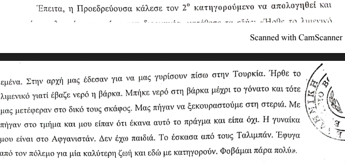 Η απολογία του Ρασούλι Ακίφ διέφερε λίγο από εκείνη του Αμίρ Ζαχίρ. Απέδωσε την άφιξη του Λιμενικού στο γεγονός ότι η βάρκα ήταν τρυπημένη και είχε βάλει νερό ως το γόνατο. «Τότε μας μετέφεραν με το δικό τους σκάφος. Μας πήγαν να ξεκουραστούμε στη στεριά. Με πήγαν στο τμήμα και μου είπαν ότι έκανα εγώ αυτό το πράγμα και είπα όχι. Η γυναίκα μου είναι από το Αφγανιστάν. Δεν έχω παιδιά. Το έσκασα από τους Ταλιμπάν. Έφυγα από τον πόλεμο για μία καλύτερη ζωή και εδώ με κατηγορούν. Φοβάμαι πάρα πολύ».