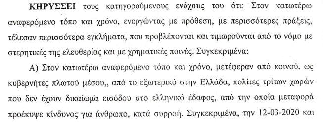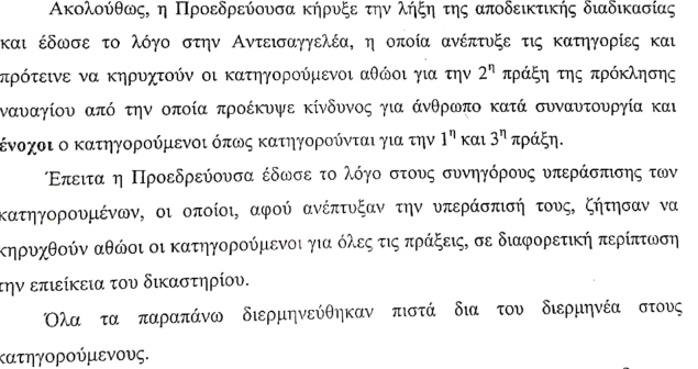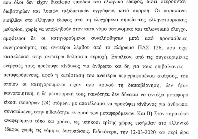 Η πρόεδρος, συντάχθηκε με την πρόταση της εισαγγελέως, κρίνοντας τους δύο κατηγορούμενους, ένοχους για μεταφορά ως κυβερνήτες πλωτού μέσου, από το εξωτερικό στην Ελλάδα, ανθρώπων τρίτων χωρών, που δεν έχουν δικαίωμα εισόδου στο ελληνικό έδαφος, από την οποία μεταφορά προέκυψε κίνδυνος για άνθρωπο, κατά συρροή, αλλά και για παράνομη είσοδο στη χώρα. Η συνολική ποινή κάθειρξης για τον κάθε κατηγορούμενο συνολικά, τα 50 έτη και συγκεκριμένα 8 έτη για κάθε μεταφερόμενο άτομο και 1 μήνα για το αδίκημα της παράνομης εισόδου στη χώρα.
