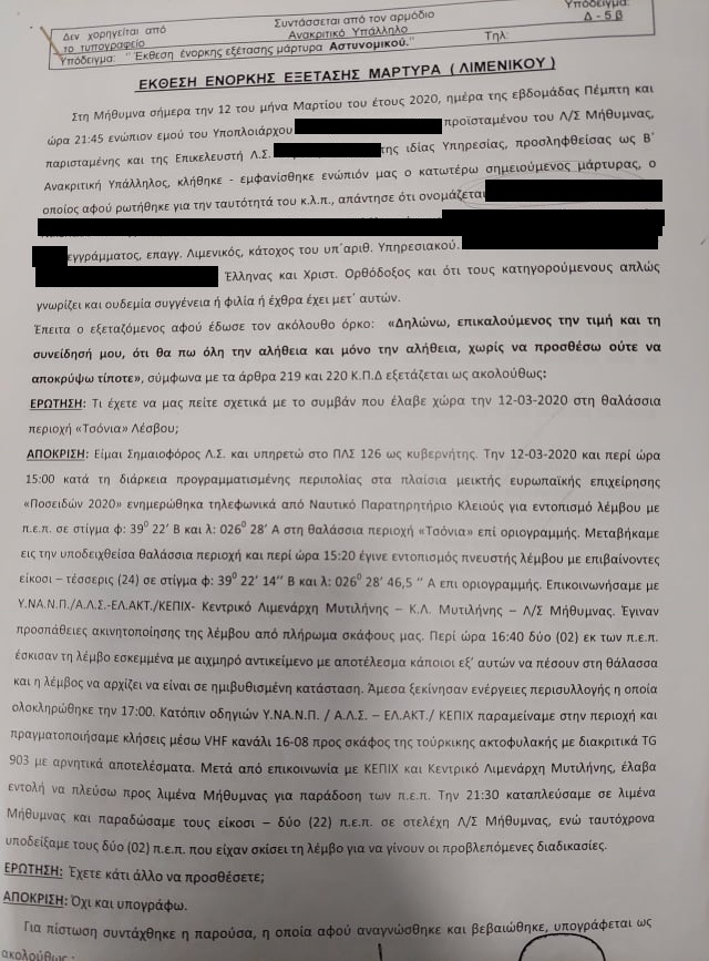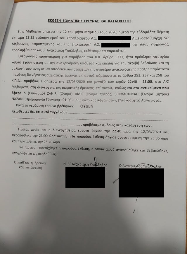 «Ενεργώντας προανάκριση για παράβαση του Π.Κ. άρθρου 277, ήτοι πρόκληση ναυαγίου, καθώς έχουν σχέση με την ανακρινόμενη υπόθεση και επειδή για την ακριβή βεβαίωση και τη συλλογή των αναγκαίων αποδεικτικών στοιχείων της ανωτέρω ανακρινόμενης πράξης, παρίσταται η ανάγκη διενέργειας σωματικής έρευνας επ’ αυτού, σύμφωνα με τα άρθρα 253, 257 και 258 του Κ.Π.Δ. προβήκαμε σήμερα την 12/03/2020 και μεταξύ των ωρών 22:40 – 23:00 στο Λιμενικό Σώμα Μυθμήνας, στη διενέργεια της σωματικής έρευνας επ’ αυτού καθώς και στα αντικείμενα που έφερε ο ZAHIRI AMIR (σ.σ. ομοίως και ο RASULI AKIF), κάτοικος Αφγανιστάν, (Υπηκοότητα) Αφγανιστάν. Κατά τη γενόμενη έρευνα βρέθηκαν: ΟΥΔΕΝ».
