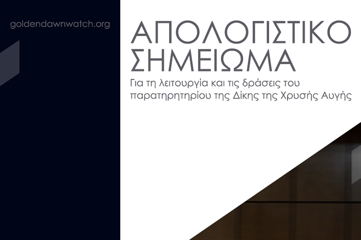 «Τον Απρίλιο του 2015 συστάθηκε η πρωτοβουλία του Παρατηρητηρίου της Δίκης της Χρυσής Αυγής με το όνομα Golden Dawn Watch και σκοπό την παρακολούθηση της Δίκης της Χρυσής Αυγής. Η πρωτοβουλία συγκροτήθηκε από την Ελληνική Ένωση για τα Δικαιώματα του Ανθρώπου, το Παρατηρητήριο για τον Φασιστικό και Ρατσιστικό λόγο στα ΜΜΕ που λειτουργεί υπό το Μορφωτικό Ίδρυμα της ΕΣΗΕΑ, τον Αντιφασιστικό Συντονισμό ΑθήναςΠειραιά και το Συμβούλιο Ένταξης Μεταναστών του Δήμου Αθηναίων