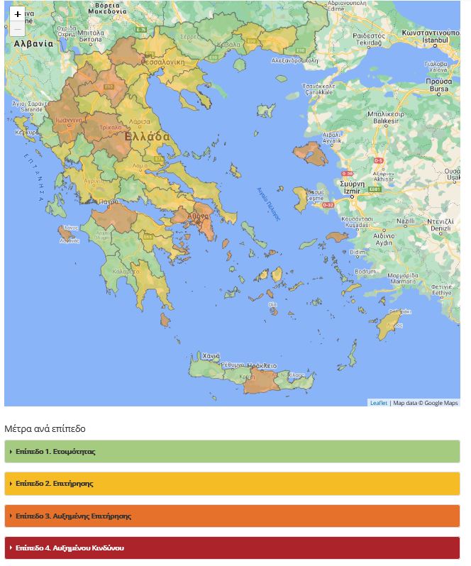 Ο υπουργός Ψηφιακής Διακυβέρνησης, Κυριάκος Πιερρακάκης.εξήγησε αναφορικά με τον χάρτη οτι «υπάρχουν τέσσερα επίπεδα προληπτικών μέτρων και κανόνων, ανάλογα με τα κρούσματα που εμφανίζει κάθε περιοχή: 1 – επίπεδο ετοιμότητας, 2 – επίπεδο επιτήρησης, 3 – επίπεδο αυξημένης επιτήρησης και 4 – επίπεδο αυξημένου κινδύνου. Ο καθορισμός του επιπέδου κινδύνου συναρτάται από την τάση των επιδημιολογικών μεγεθών».