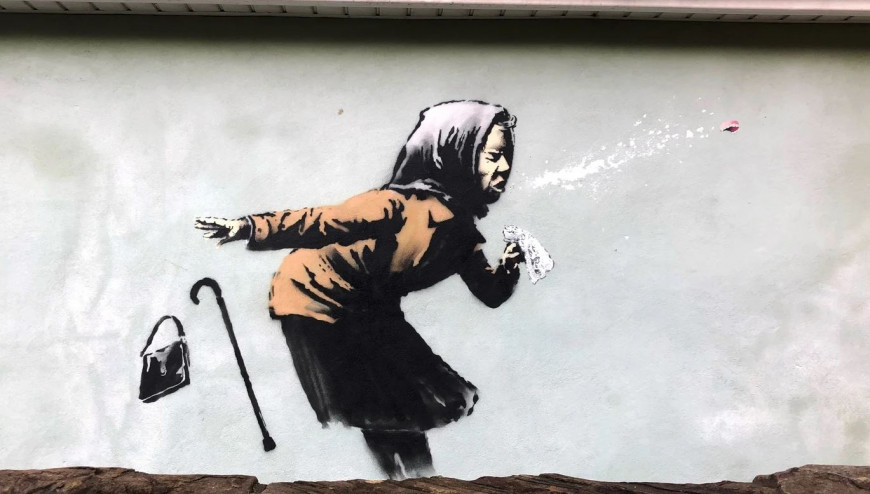 Το έργο τέχνης του γνωστού και μυστηριώδη street artist δείχνει μια γυναίκα να κρατάει ένα μαντήλι, ενώ το μπαστούνι και η τσάντα της πέφτουν καθώς χάνει την τεχνητή οδοντοστοιχία από το δυνατό φτέρνισμα. Ο Banksy επιβεβαίωσε στον ιστότοπό του και στο λογαριασμό του στο Instagram το απόγευμα της Πέμπτης ότι το έργο ήταν δικό του.
