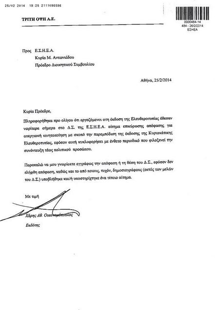 Ο Χάρης Οικονομόπουλος ζητεί, με έγγραφό του, από την πρόεδρο της ΕΣΗΕΑ να του κοινοποιήσει ποιοί στο Δ.Σ. της Ενωσης, είπαν και τί ψήφισαν, με βάση -την πρόταση της συνέλευσης των εργαζομένων στην εταρεία του (Τρίτη Οψη που νοικιάζει τον τίτλο της έκδοσης από την Μάνια Τεγοπούλου)- για κήρυξη απεργιάς στην Κυριακάτικη Ελευθεροτυπία (και για μη καταβολή δεδουλευμένων).