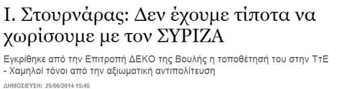 Την είδηση για την αλλαγή στάσης του ΣΥΡΙΖΑ, επί το θετικότερο υποτίθεται, έδωσε ο ίδιος ο Γ. Στουρνάρας, ο οποίος βγαίνοντας από τη Βουλή και κατευθυνόμενος προς τους δημοσιογράφους, τους δήλωσε: «Δεν έχουμε τίποτα να χωρίσουμε με τον ΣΥΡΙΖΑ. Πράγματι ήταν μια ήπια κριτική».
