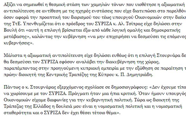 Όσο συνηθισμένος κι αν είναι όμως ο Γ.Στουρνάρας στην κριτική κι όσο ασυγκίνητο να τον αφήνει, δεν μπορεί να πιστεύει ότι αυτή ήταν μια ήπια κριτική.