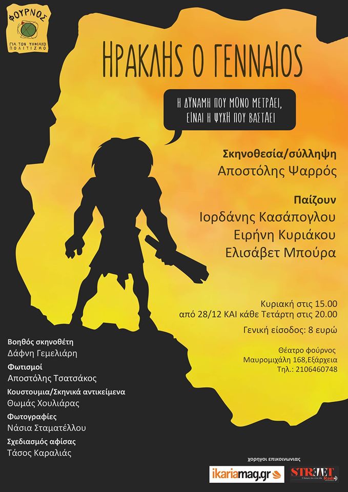 Τα τρία παιδιά της παράστασης, ο Ιορδάνης Κασάπογλου, η Ειρήνη Κυριάκου και η Ελισάβετ Μπούρα, μοιράζουν με χαρά και ζωντάνια στα παιδιά όλων των ηλικιών τον μύθο του Ηρακλή, και όλα εκείνα τα υλικά που μπορούν να χρησιμοποιηθούν από τον καθένα, για να χτίσει τον δικό του, προσωπικό μύθο.