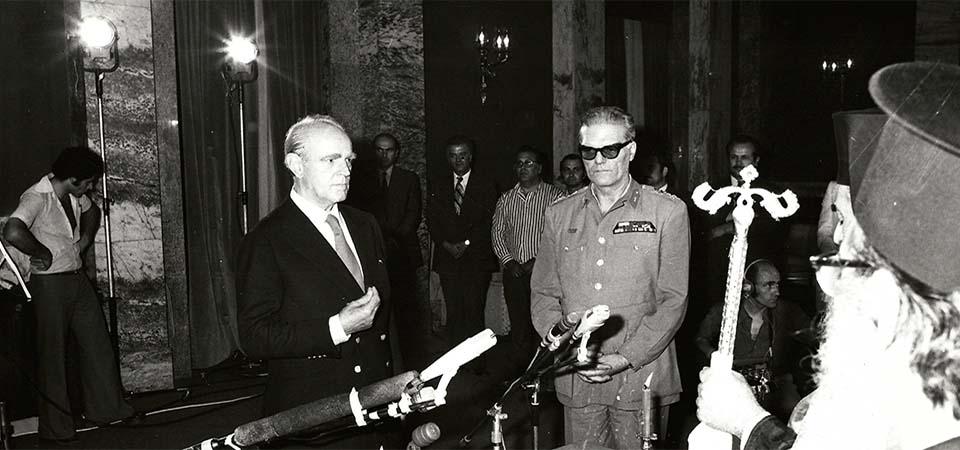 - Απ’ όταν ο Καραμανλής παραλάμβανε την διακυβέρνηση της χώρας από τον Φαίδωνα Γκιζίκη και ορκιζόταν ενώπιόν του, ενώπιον, δηλαδή, του ίδιου ανθρώπου που μετά τον Πολυτεχνείο και λόγω του Πολυτεχνείου διοριζόταν «Πρόεδρος της Δημοκρατίας» της χούντας.