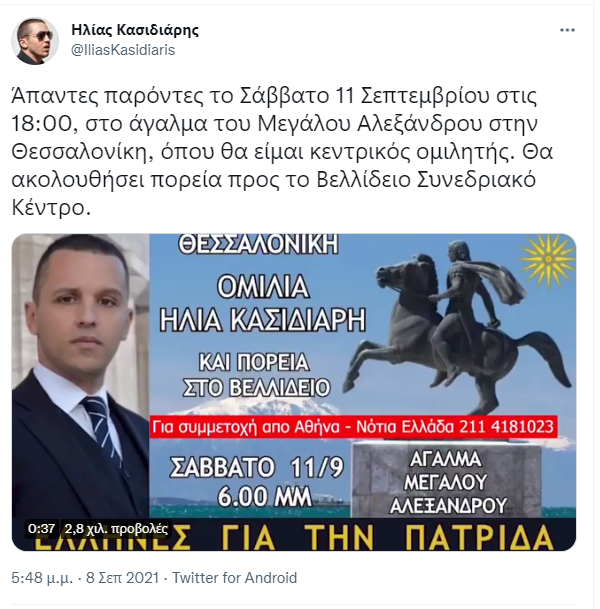 «Άπαντες παρόντες το Σάββατο 11 Σεπτεμβρίου στις 18:00, στο άγαλμα του Μεγάλου Αλεξάνδρου στην Θεσσαλονίκη, όπου θα είμαι κεντρικός ομιλητής. Θα ακολουθήσει πορεία προς το Βελλίδειο Συνεδριακό Κέντρο» γράφει στο κάλεσμα.