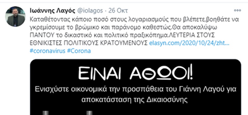 Μάλιστα, ο καταδικασμένος Ι. Λαγός υπογραμμίζει σε ανάρτηση του: «Καταθέτοντας κάποιο ποσό στους λογαριασμούς που βλέπετε, βοηθάτε να γκρεμίσουμε το βρώμικο και παράνομο καθεστώς, Θα αποκαλύψω ΠΑΝΤΟΥ το δικαστικό και πολιτικό πραξικόπημα, Λευτεριά στους εθνικιστές πολιτικούς κρατούμενους».