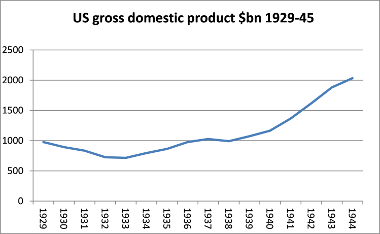 Οι κεϋνσιανοί, χρησιμοποιούν συχνά, ως μελέτη περίπτωσης την Μεγάλη Ύφεση του 1929 και τις απαντήσεις σε αυτήν -ιδίως την πολιτική του New Deal, που εφάρμοσε η κυβέρνηση των ΗΠΑ, υπό τον Ρούσβελτ. Το παρακάτω διάγραμμα, που παρουσιάζει την πορεία του αμερικανικού ΑΕΠ, στα χρόνια μετά το 1929, συνιστά ένα βασικό τους επιχείρημα.