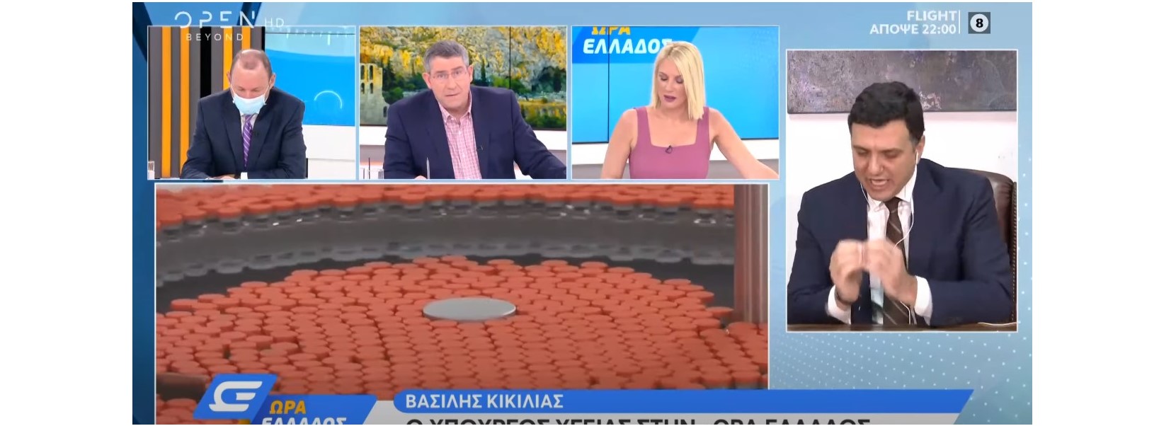 Στη συνέχεια, έπειτα από μερικά λεπτά παρουσίας στην τηλεοπτική εκπομπή γεμάτα ένταση, καθώς και νωρίτερα είχε δείξει τη δυσαρέσκειά του από την αντιμετώπιση των δημοσιογράφων, ο υπουργός δέχθηκε μία ερώτηση για τον εμβολιασμό των πολιτών η οποία είχε ως αποτέλεσμα την ακόμα πιο έντονη δυσαρέσκειά του. Η ερώτηση είχε να κάνει με τους αρνητές της πανδημίας και του εμβολιασμού, με τον Β. Κικίλια να αποφασίζει να μιλήσει για το εμβόλιο κατά της γρίπης και την συμμετοχή του κόσμου.