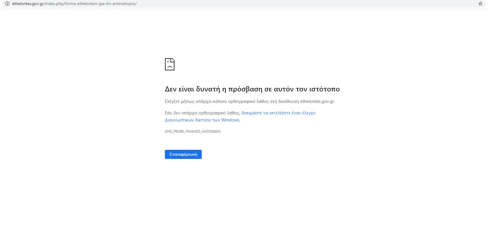 Οκτώ μήνες αργότερα, και την ώρα που η κυβέρνηση δεν προχώρησε σχεδόν σε καμία ενίσχυση των κλάδων για τους οποίους ζητούσε εθελοντές, η σχετική πλατφόρμα του υπουργείου Υγείας δεν βρίσκεται σε λειτουργία, καθώς όταν κάποιος επιχειρεί να συνδεθεί, στην οθόνη του εμφανίζεται το μήνυμα «Δεν είναι δυνατή η πρόσβαση σε αυτόν τον ιστότοπο». Μάλιστα, το γεγονός προκύπτει ακόμα πιο εξοργιστικό, δεδομένου πως τις τελευταίες ημέρες ο υπουργός Υγείας «διαφημίζει» την αυταπάρνηση νοσηλευτριών και νοσηλευτών από την Κρήτη και άλλα σημεία της Ελλάδας, που σπεύδουν στην Βόρεια Ελλάδα για να στηρίξουν το σύστημα, το οποίο η κυβέρνηση άφησε γυμνό ενόψει δεύτερου κύματος.