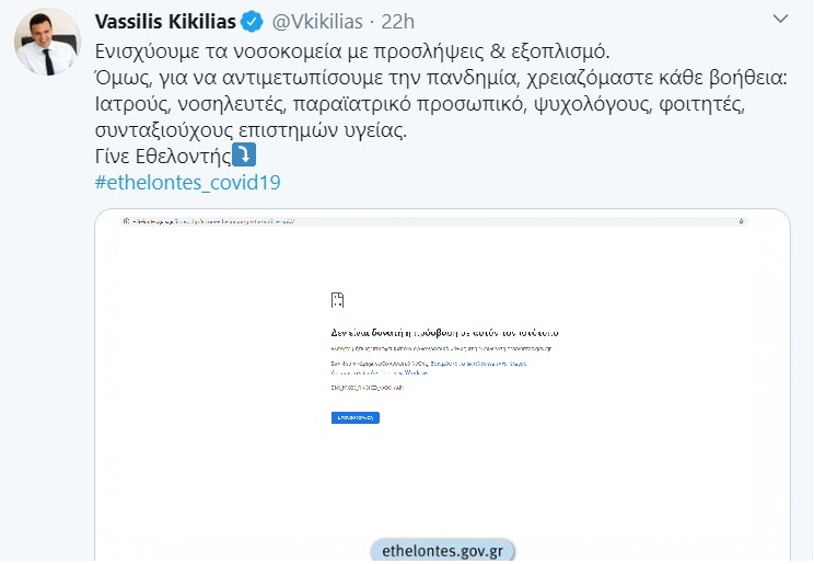 Επρόκειτο για την πλατφόρμα ethelontes.gov.gr, για την οποία ο υπουργός Κικίλιας έγραφε τότε «Ενισχύουμε τα νοσοκομεία με προσλήψεις και εξοπλισμό. Όμως, για να αντιμετωπίσουμε την πανδημία χρειαζόμαστε κάθε βοήθεια: Ιατρούς, νοσηλευτές, παραϊατρικό προσωπικό, ψυχολόγους, φοιτητές, συνταξιούχους επιστημών υγείας. Γίνε Εθελοντής», προσθέτοντας στο τέλος του μηνύματος και το σχετικό hastag, #ethelontes_covid19. Σύμφωνα με τον ίδιο, δύο ημέρες αργότερα, είχαν εγγραφεί στην πλατφόρμα σχεδόν 9.000 πολίτες.