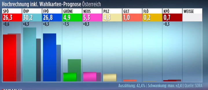 Σύμφωνα με αυτές τις πρώτες εκτιμήσεις (με μία απόκλιση έως 2%) το Λαϊκό Κόμμα αυξάνει το ποσοστό του κατά 6,3 ποσοστιαίες μονάδες στο 30,2%, το Κόμμα των Ελευθέρων αποσπά ένα 26,8% (ποσοστό αυξημένο κατά επίσης 6,3 μονάδες), ενώ οι Σοσιαλδημοκράτες του απερχόμενου καγκελάριου Κρίστιαν Κερν που ήταν πρώτο κόμμα σε όλες τις βουλευτικές εκλογές των τελευταίων δεκαετιών περιορίζονται σε ποσοστό 26,3% (χάνοντας 0,6%).